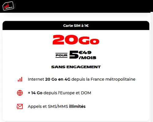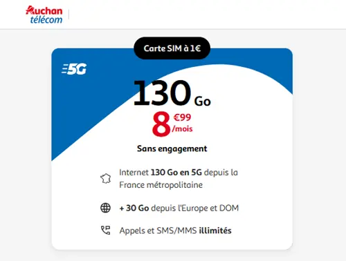 CDiscount Mobile propose ce forfait 5G 300Go sur réseau Bouygues à 13€ par moisappels/sms/mms illimités* depuis France, Europe, DOM300Go de data sur réseau 5G Bouygues – débit réduit au delà42Go de data en 4G depuis Europe/DOM12,99€/mois sans limite de duréesans engagementcarte SIM 1€ à la commande*