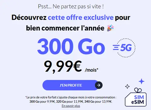 Prixtel propose ce gros forfait mobile 5G avec 300Go pour 10€ par mois seulement.Pour y accéder, attendez patiemment quelques secondes sur une page du site Prixtel puis faites mine de quitter le site, il affichera alors la fenêtre pop-up qui vous proposera cette Série Spéciale !appels, sms, mms illi