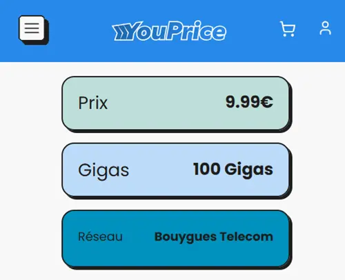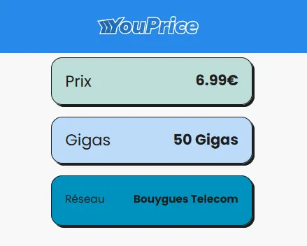 Youprice propose ce forfait illimité 150Go sur réseau SFR à 7,99€ par moisappels, sms, mms illimités* depuis la France, Europe dont Monaco et DOM150Go sur réseau 4G SFR, payant au-delà10Go depuis Europe, Monaco et DOM7,99€/mois sans limite de duréesans engagementAppels / SMS Wifi (VoWIFI) et appels