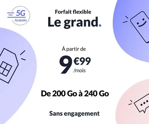 Youprice propose ce forfait illimité 60Go en 4G sur réseau SFRappels, sms, mms illimités* depuis la France, Europe dont Monaco et DOM60Go sur réseau 4G SFR, payant au-delà / option 5G +5€/mois12Go depuis Europe, Monaco et DOM5,99€/mois sans limite de duréesans engagementappels / SMS Wifi (VoWIFI) et