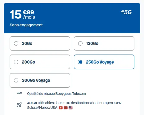SFR propose ce forfait 80Go 5G pour ses clients Box Internetappels/sms/mms illimités* depuis/vers la France, Europe, DOM, Andorre et Suisse80Go de data sur réseau 5G+ SFR – débit réduit au-delà80Go de data depuis Europe, DOM, Suisse et Andorresans engagement17,99€/mois (ou)11,99€/mois sans limite de
