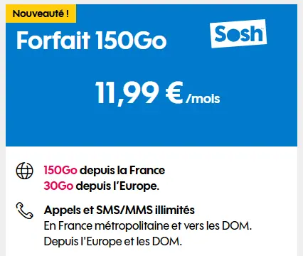 Youprice propose ce forfait illimité 250Go sur réseau 5G Orangeappels, sms, mms illimités* depuis la France, Europe dont Monaco et DOM250Go sur réseau 5G Orange, payant au-delà18Go depuis Europe et DOM10,99€/mois sans limite de duréesans engagementAppels / SMS Wifi (VoWIFI) et appels 4G (VoLTE) si v