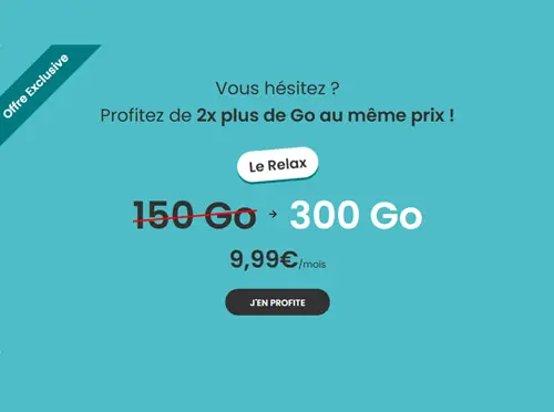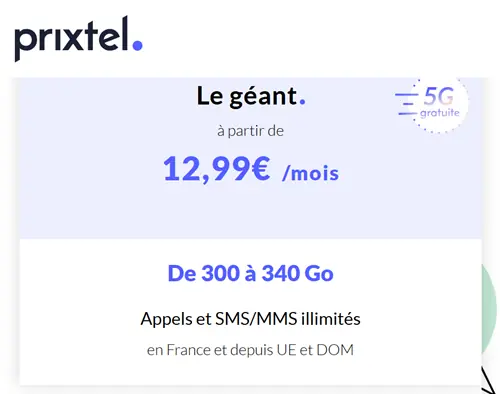 Youprice propose ce forfait 5G illimité 100Go sur réseau SFR à 6,99€ par mois, qui conviendra si vous vous moquez d’avoir la 5G.appels, sms, mms illimités* depuis la France, Europe dont Monaco et DOM100Go sur réseau 4G SFR, payant au-delà / option 5G +5€/mois10Go depuis Europe, Monaco et DOM6,99€/mo